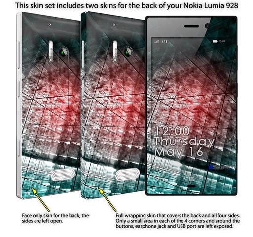 • Decal style vinyl skin covers front, back and side of Nokia Lumia 928 phone.