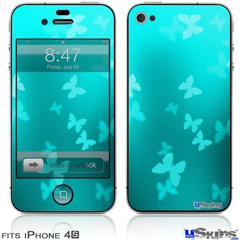 iPhone 4S Decal Style Vinyl Skin - Bokeh Butterflies Neon Teal