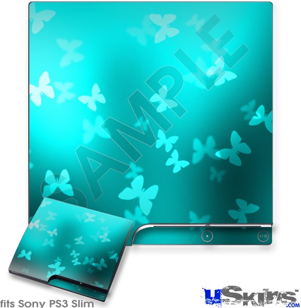 Decal Skin compatible with Sony PS3 Slim Bokeh Butterflies Neon Teal