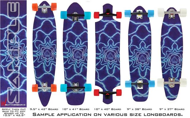 Our longboard skins are made so that one size fits boards up to 10” wide x 42” long. This means after applying the skin it you will trimming to fit you’re the shape of your board with a sharp utility knife.