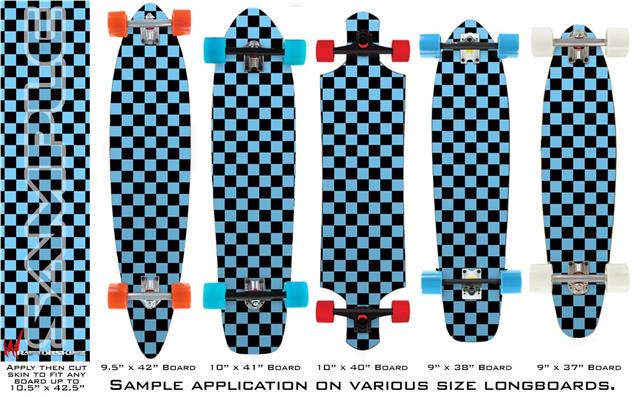 Our longboard skins are made so that one size fits boards up to 10” wide x 42” long. This means after applying the skin it you will trimming to fit you’re the shape of your board with a sharp utility knife.
