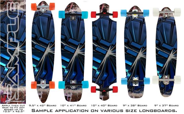 Our longboard skins are made so that one size fits boards up to 10” wide x 42” long. This means after applying the skin it you will trimming to fit you’re the shape of your board with a sharp utility knife.