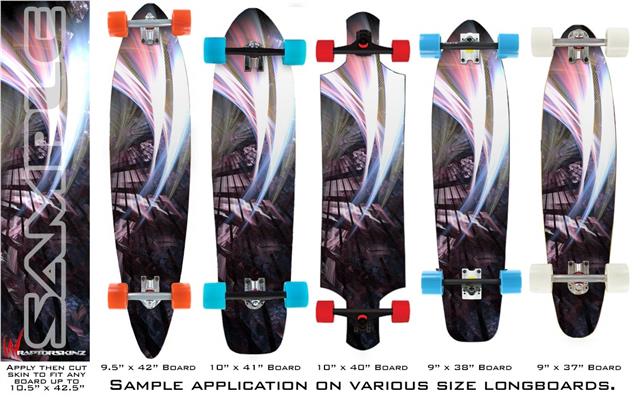 Our longboard skins are made so that one size fits boards up to 10” wide x 42” long. This means after applying the skin it you will trimming to fit you’re the shape of your board with a sharp utility knife.