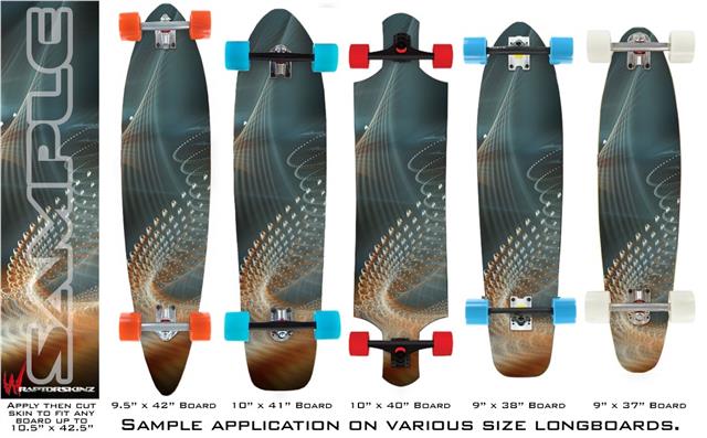 Our longboard skins are made so that one size fits boards up to 10” wide x 42” long. This means after applying the skin it you will trimming to fit you’re the shape of your board with a sharp utility knife.