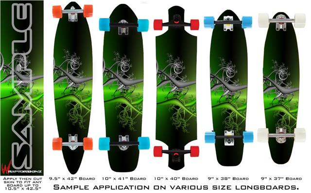 Our longboard skins are made so that one size fits boards up to 10” wide x 42” long. This means after applying the skin it you will trimming to fit you’re the shape of your board with a sharp utility knife.