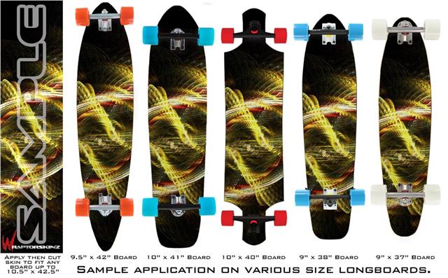 Our longboard skins are made so that one size fits boards up to 10” wide x 42” long. This means after applying the skin it you will trimming to fit you’re the shape of your board with a sharp utility knife.
