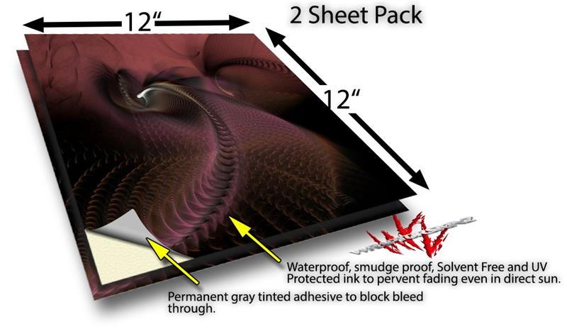 WraptoSkinz™ skin vinyl craft sheets are printed using superb photo quality designs and vibrant colors printed with special UV Protected fade resistant inks that last even in direct sun for years. Unlike other brands our inks are NOT solvent based. WraptorSkinz are a manufactured from professional grade 3mill vinyl. These sheets are waterproof, the designs will not run or smear even if submerged in water.