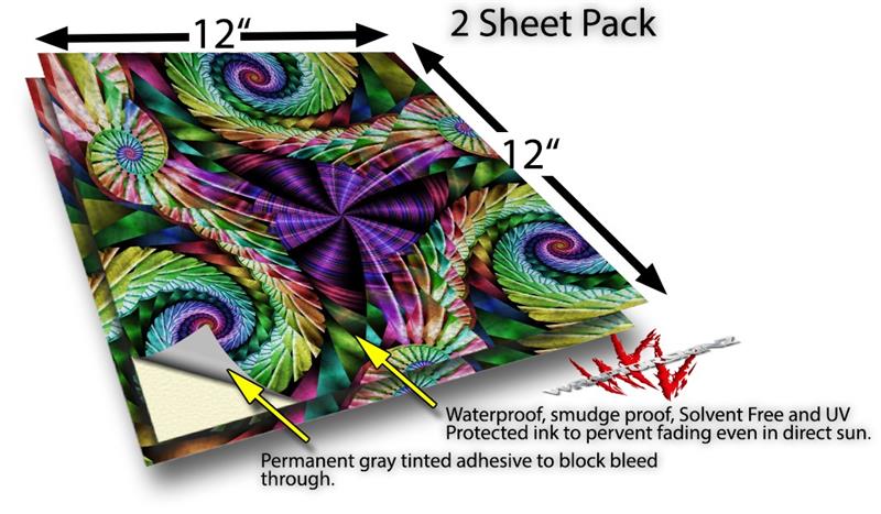 WraptoSkinz™ skin vinyl craft sheets are printed using superb photo quality designs and vibrant colors printed with special UV Protected fade resistant inks that last even in direct sun for years. Unlike other brands our inks are NOT solvent based. WraptorSkinz are a manufactured from professional grade 3mill vinyl. These sheets are waterproof, the designs will not run or smear even if submerged in water.