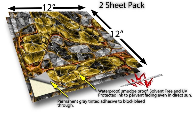 WraptoSkinz™ skin vinyl craft sheets are printed using superb photo quality designs and vibrant colors printed with special UV Protected fade resistant inks that last even in direct sun for years. Unlike other brands our inks are NOT solvent based. WraptorSkinz are a manufactured from professional grade 3mill vinyl. These sheets are waterproof, the designs will not run or smear even if submerged in water.