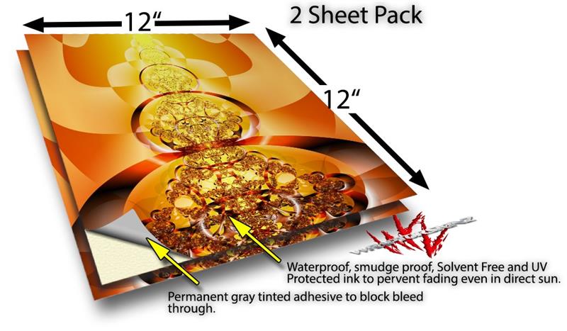WraptoSkinz™ skin vinyl craft sheets are printed using superb photo quality designs and vibrant colors printed with special UV Protected fade resistant inks that last even in direct sun for years. Unlike other brands our inks are NOT solvent based. WraptorSkinz are a manufactured from professional grade 3mill vinyl. These sheets are waterproof, the designs will not run or smear even if submerged in water.