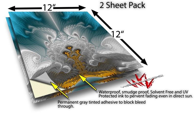 WraptoSkinz™ skin vinyl craft sheets are printed using superb photo quality designs and vibrant colors printed with special UV Protected fade resistant inks that last even in direct sun for years. Unlike other brands our inks are NOT solvent based. WraptorSkinz are a manufactured from professional grade 3mill vinyl. These sheets are waterproof, the designs will not run or smear even if submerged in water.
