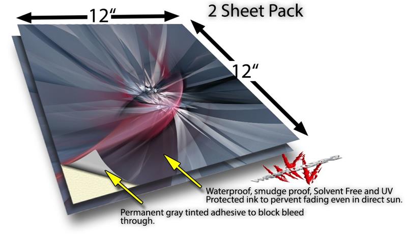 WraptoSkinz™ skin vinyl craft sheets are printed using superb photo quality designs and vibrant colors printed with special UV Protected fade resistant inks that last even in direct sun for years. Unlike other brands our inks are NOT solvent based. WraptorSkinz are a manufactured from professional grade 3mill vinyl. These sheets are waterproof, the designs will not run or smear even if submerged in water.