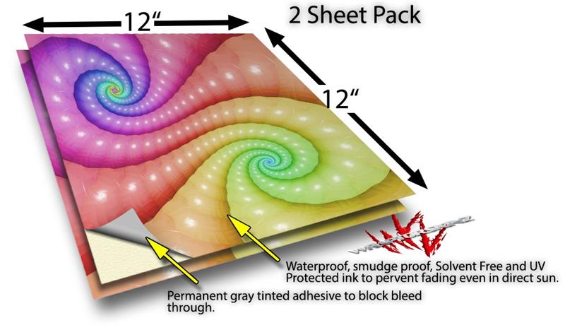 WraptoSkinz™ skin vinyl craft sheets are printed using superb photo quality designs and vibrant colors printed with special UV Protected fade resistant inks that last even in direct sun for years. Unlike other brands our inks are NOT solvent based. WraptorSkinz are a manufactured from professional grade 3mill vinyl. These sheets are waterproof, the designs will not run or smear even if submerged in water.