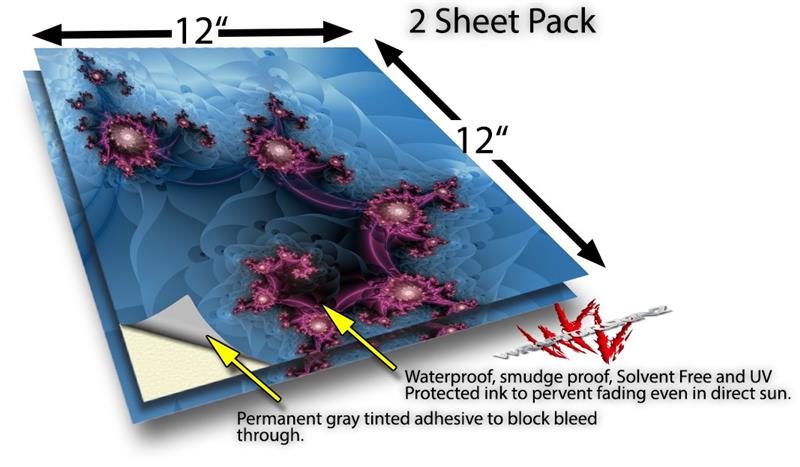 WraptoSkinz™ skin vinyl craft sheets are printed using superb photo quality designs and vibrant colors printed with special UV Protected fade resistant inks that last even in direct sun for years. Unlike other brands our inks are NOT solvent based. WraptorSkinz are a manufactured from professional grade 3mill vinyl. These sheets are waterproof, the designs will not run or smear even if submerged in water.