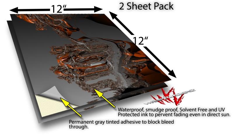 WraptoSkinz™ skin vinyl craft sheets are printed using superb photo quality designs and vibrant colors printed with special UV Protected fade resistant inks that last even in direct sun for years. Unlike other brands our inks are NOT solvent based. WraptorSkinz are a manufactured from professional grade 3mill vinyl. These sheets are waterproof, the designs will not run or smear even if submerged in water.