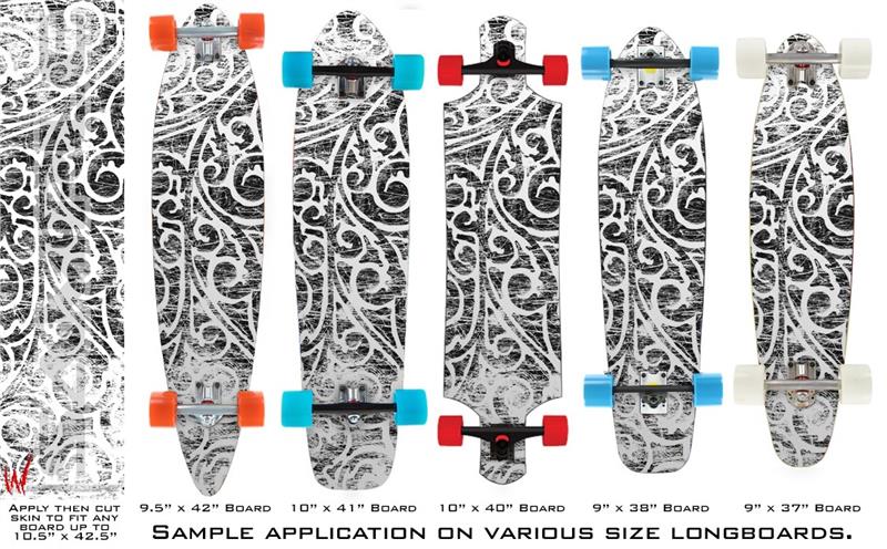 Our longboard skins are made so that one size fits boards up to 10” wide x 42” long. This means after applying the skin it you will trimming to fit you’re the shape of your board with a sharp utility knife.